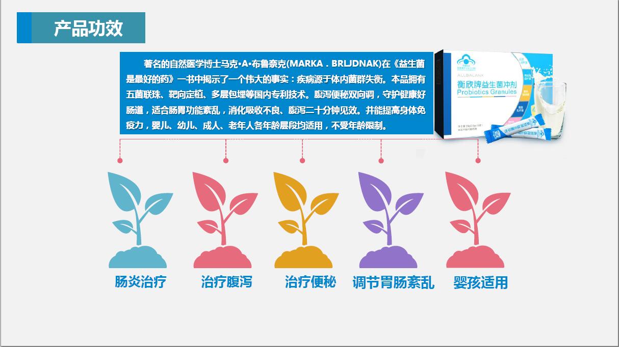益生菌是最好的藥,書中提示了一個偉大的事實,疾病源于體內(nèi)均群失衡,那么我們的益生菌產(chǎn)品呢,是國食健字號,擁有了五菌連珠,靶向,定植,多層包埋等國內(nèi)的專利技術(shù)。