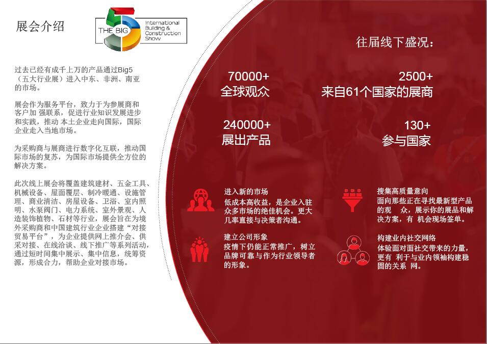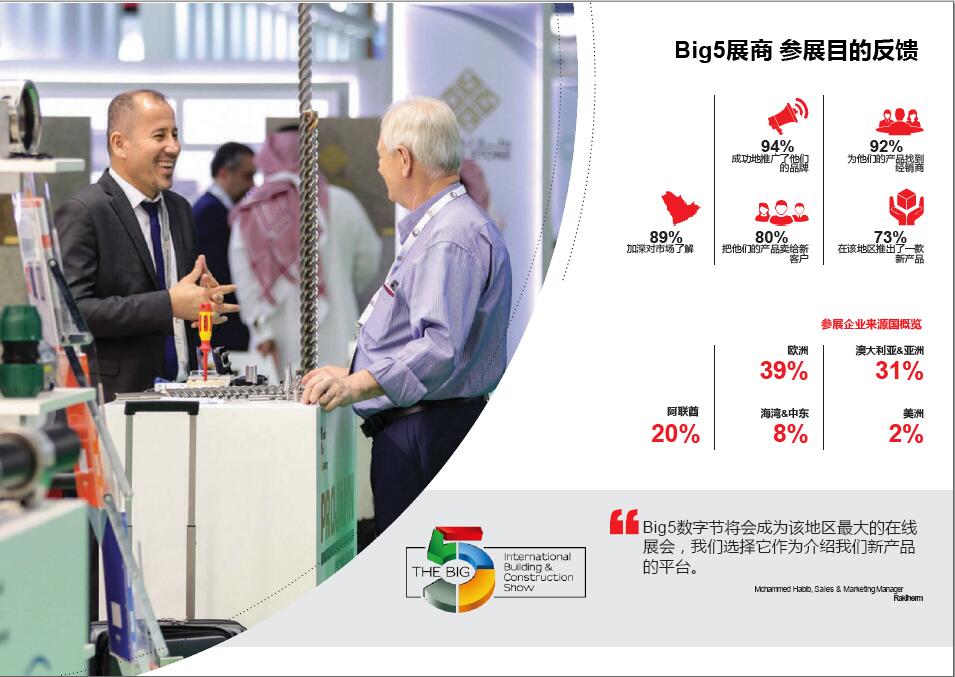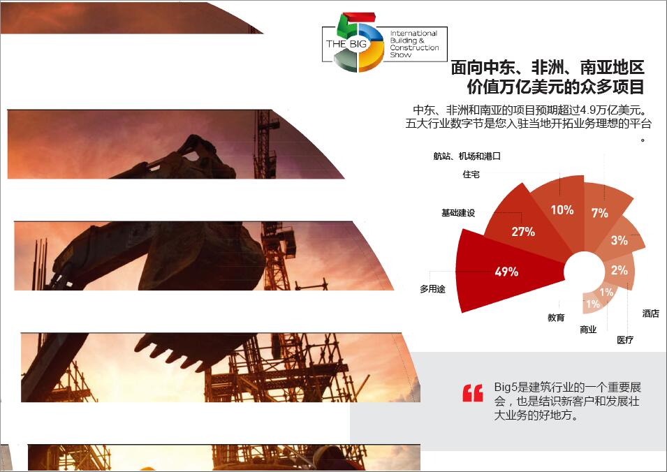 始辦于1980年的中東迪拜五大行業(yè)展(BIG5)是中東地區(qū)具影響力且是大型的建筑、建材及服務(wù)類展覽會。同時(shí)其衍生展中東五大行業(yè)建筑機(jī)械、車輛及設(shè)備展覽會(BIG5PMV)是專注于中東地區(qū)建筑設(shè)備、機(jī)械、工具和車輛的專業(yè)展會。如今,中東地區(qū)建筑市場的火暴和持續(xù)發(fā)展,帶動了對建筑設(shè)備、材料、工程機(jī)械及車輛的強(qiáng)烈需求,更吸引了全球的關(guān)注。